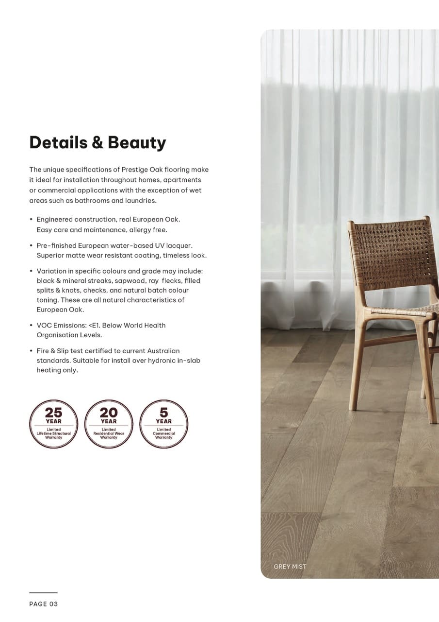 Prestige Oak engineered timber flooring combines the natural beauty of genuine European Oak with advanced engineered construction designed for the conditions found across Australia and New Zealand. Widely specified by architects, designers and flooring professionals, Prestige Oak offers wide plank formats, durable pre-finished coatings and installation flexibility suited to modern residential and commercial interiors.