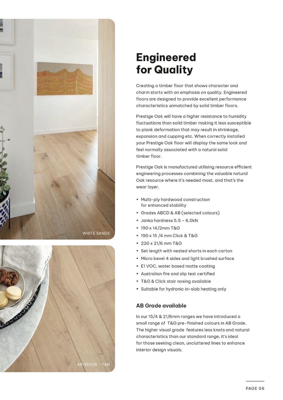 Prestige Oak engineered flooring is suitable for installation across a wide range of interior spaces including residential homes, apartments and selected commercial environments. The flooring can also be installed over hydronic in-slab heating systems when installed according to manufacturer recommendations.