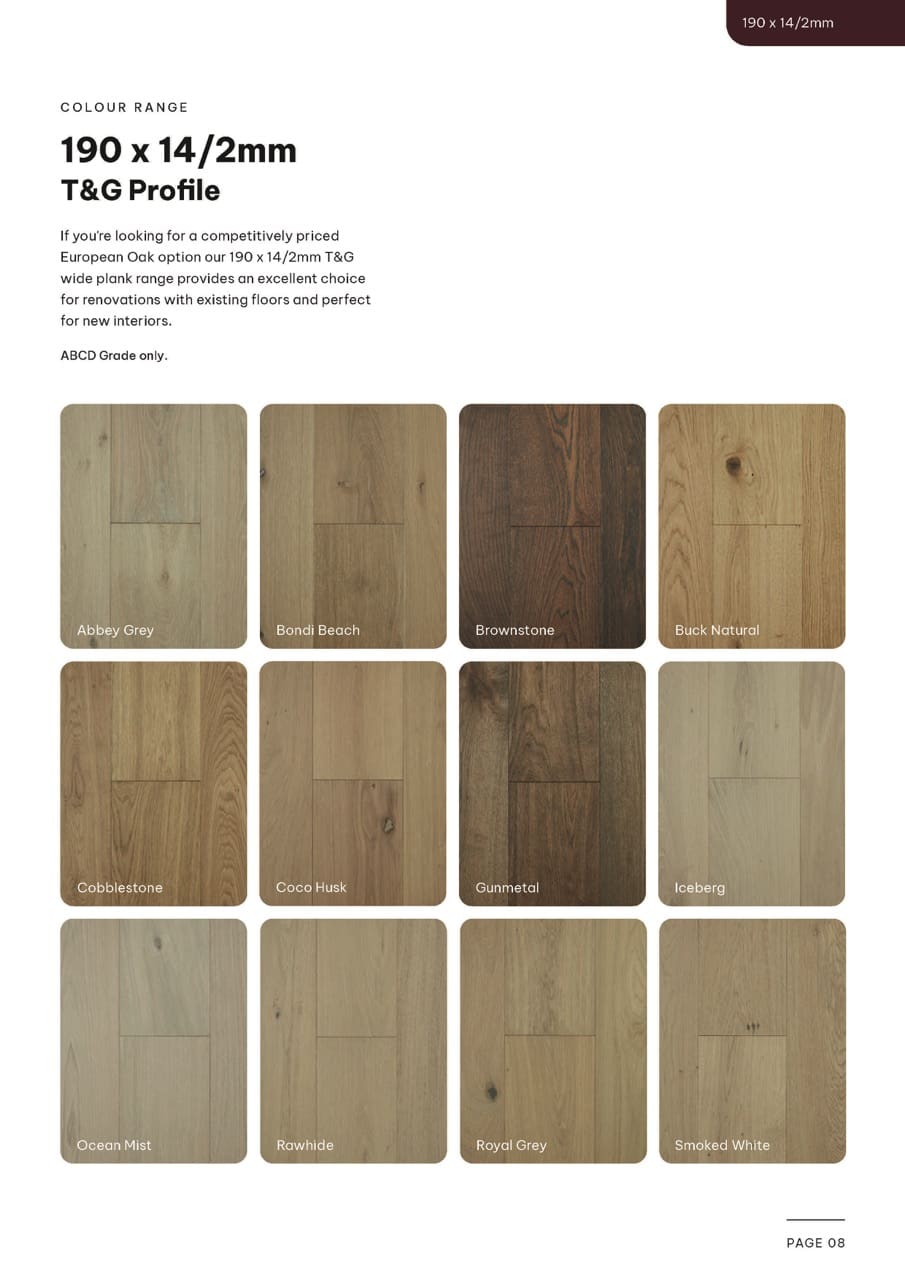 If you’re looking for a competitively priced European Oak option our 190 x 14/2mm T&G range provides an excellent choice for renovations with existing floors and perfect for new interiors. Great price point and a nice tidy 12 colour palette.
